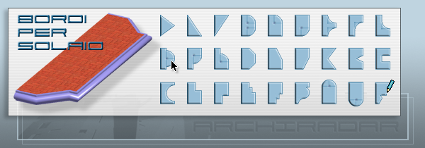 Oggetto accessorio (da usare con il comando Accessori Solaio) che permette di aggiungere una modanatura di forma predefinita o personale ad uno o più bordi di un solaio selezionato.